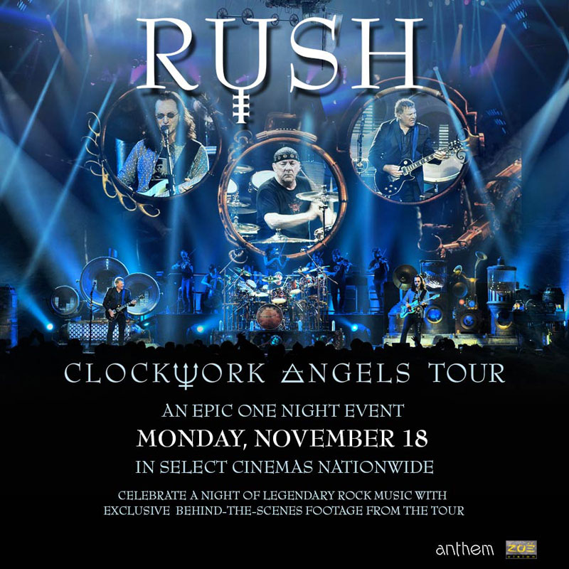 The one-night cinema event “RUSH: Clockwork Angels Tour” will take place on Monday, Nov. 18 at 7:00 p.m. local time.
