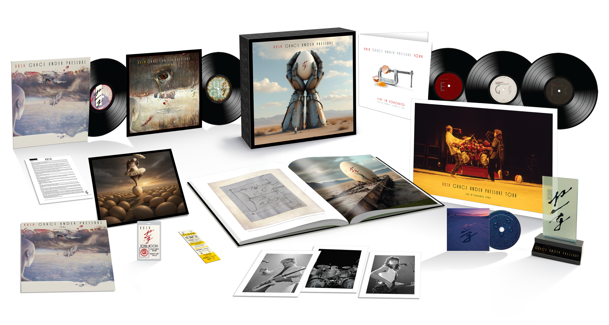 The Super Deluxe Edition of Grace Under Pressure will also include new liner notes penned by Geddy Lee, reflecting on his memories of finding a new producer for the album and reminiscing on a recent re-listen of the album proper. Original album designer Hugh Syme re-imagines the original album cover along with creating brand-new illustrations for each of the album’s eight songs and other related visual elements in the book. Exclusive bonus collectibles in the box include a custom acrylic Grace Under Pressure LED light-up display; a replica of the Grace Under Pressure tour book; a replica Maple Leaf Gardens/Toronto show concert ticket; a Grace Under Pressure Tour total access backstage pass; “Pressure Release” a replica of the 6-page press release; three bandmember live photo lithos; and a poster from the Toronto show. All contents are housed in a premium lift-top box.